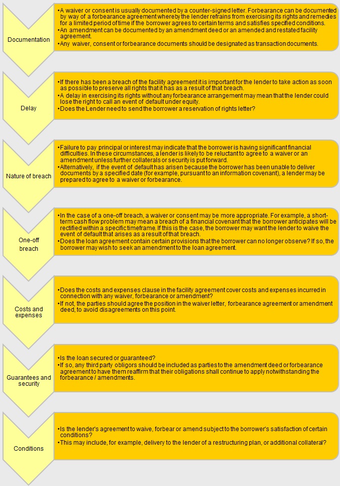 This alert considers other alternatives available to the lender, namely, waiving the borrower's breach, amending the facility agreement and forbearance.