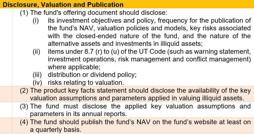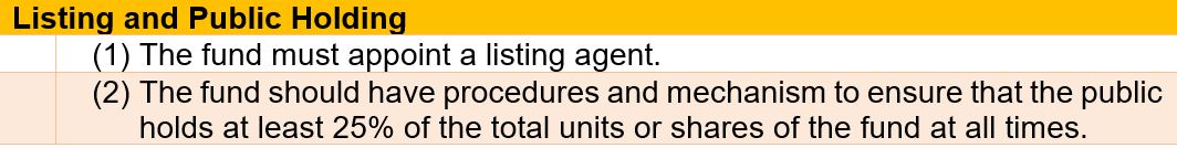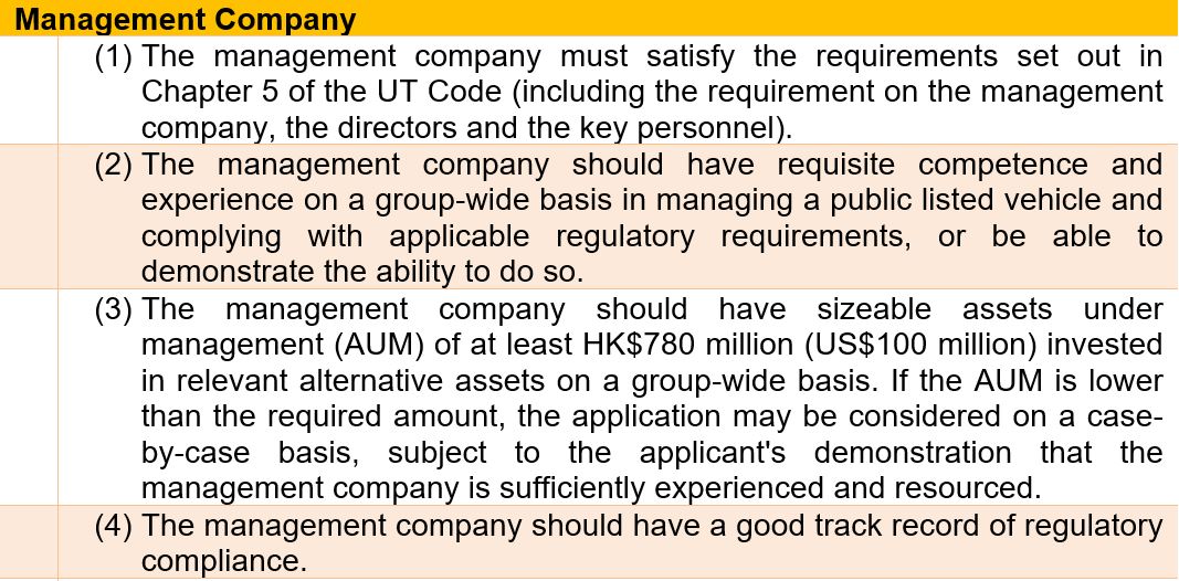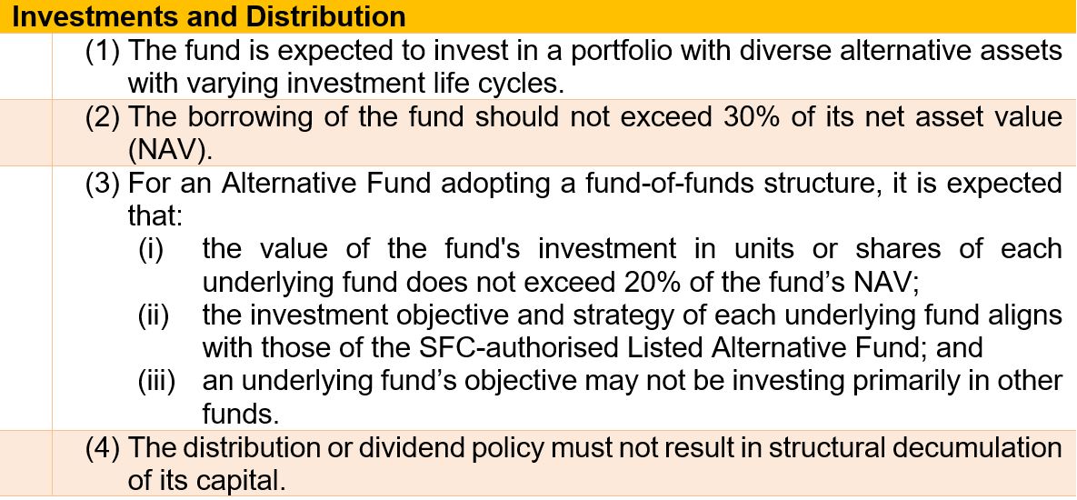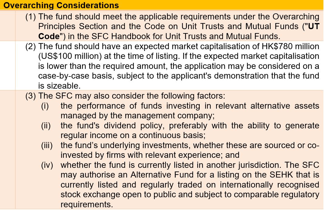 In order to be a Listed Alternative Fund, both the eligible Alternative Fund and its offering documents must be authorized by the SFC and listed on the SEHK. The table below sets out some of the key requirements for obtaining the SFC's authorisation under the Circular.